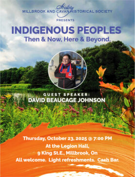 Thursday, October 23, 7:00 pm, we welcome as our guest speaker David Beaucage Johnson, presenting a dynamic talk on Indigenous Peoples Then and Now, Here and Beyond. This, our season-opening event, will take place at the Millbrook Legion Hall, 9 King Street East, with doors open at 6:45.